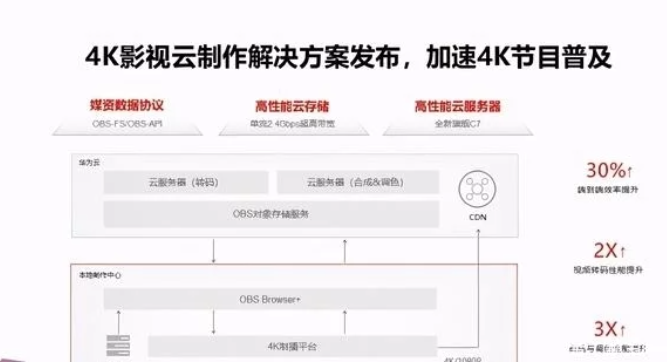 对影视制作行业来说,制作4K节目,影视素材的规模是普通高清节目的5~8倍,对存储空间、数据处理效率的要求非常高。现在,基于OBS对象存储的多协议能力,华为云发布全新4K影视云制作解决方案,为4K媒资制播平台提供海量存储空间,突破性能瓶颈,满足4K节目剪辑,渲染,转码等多种场景对存储性能苛刻要求,为4K节目制作带来30%以上的效率提升。